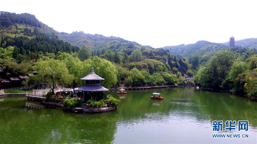 5月11日,游客在济南红叶谷风景区游玩(无人机拍摄)。 初夏的泉城济南翠绿欲滴、泉水潺潺,市民和游客在大明湖、泉水公园等景区徜徉游览,构成一幅幅美丽图画。 新华社发(武纪全 摄)