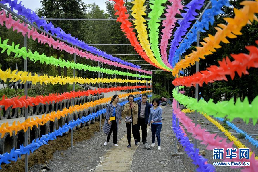 5月13日,游人在湖北省宣恩县二台坪村的“风车长廊”观光游玩。 湖北省恩施土家族苗族自治州宣恩县沙道沟镇二台坪村是个三面临崖的高山乡村,在实施精准扶贫过程中,于2018年修通了进村水泥路。随着交通条件的改善,当地村民联合成立旅游经营公司,推进以绿色生态为底色的“多彩乡村游”,让昔日沉寂的乡村变得多姿多彩。 新华社发(宋文 摄)