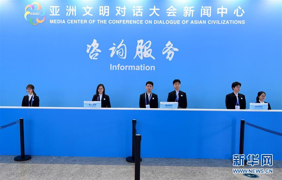 5月14日,志愿者在新闻中心咨询服务台上岗。 亚洲文明对话大会开幕在即。大会新闻中心位于北京国家会议中心。据介绍,亚洲文明对话大会注册记者2900余人。其中,境外媒体记者380余人。 新华社记者王毓国摄