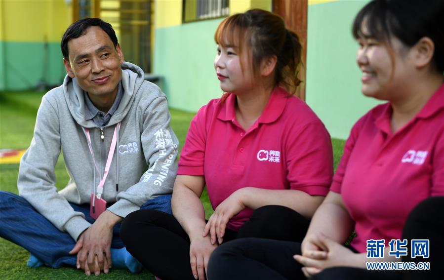 一天的课程结束后,岳友林(左)和城南养育中心的同事一起开会(5月11日摄)。 2018年上半年,地处秦岭腹地的陕西省宁陕县开始整县试点“养育未来”项目,为0-3岁孩子提供免费早教,对幼儿家长进行养育培训,帮助贫困地区孩子们更好地成长。如今,宁陕县已开设了26所“养育中心”,岳友林是全部61名养育师中唯一的男性。 在宁陕,青壮男性基本都会外出打工,从没外出打过工的岳友林自诩是个比较“另类”的丈夫和爸爸。因为爱人在乡镇小学当老师,工作忙,岳友林承担起大部分照顾孩子的责任。十年前女儿出生后,他当了大半年的全职爸爸,后来在县城开了一家家电修理铺,可以随时回家照顾孩子。儿子出生后,他看到县里养育中心招聘养育师的广告,自己符合全部条件,便动了心,觉得这份工作可以让自己更好地了解孩子。 经过笔试、面试,岳友林成功被录用为养育师,进入养育中心教幼儿家长如何带娃。面对以女性为主的家长群体,岳友林也经历过不被信任的时候。为了显得有亲和力,他每天都把胡子刮得干干净净;为了讲好故事,自己在家里跟着故事机和手机软件练习……如今,随着养育中心的逐步推广,家长的育儿观念也开始变化,逐渐认识到儿童早期教育的重要性。岳友林说,他想让更多家长认识到陪伴的重要意义,认识到男性也能带好孩子,让“父爱”更好地护航孩子的成长之路。 新华社记者 刘潇 摄