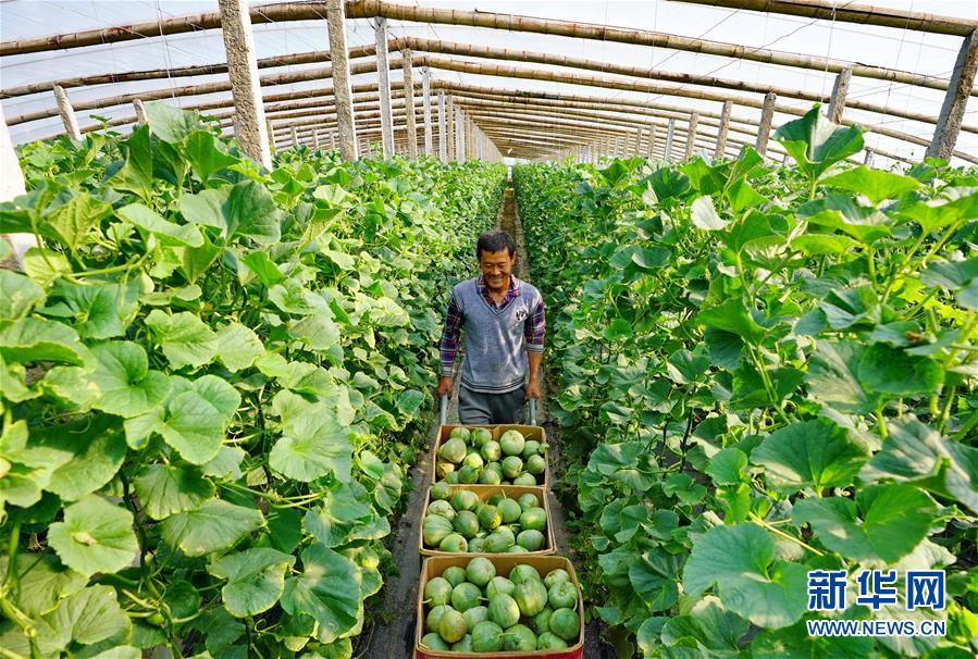5月14日,唐山海港经济开发区王滩镇农民将刚采摘的甜瓜运出大棚。 近年来,河北省唐山海港经济开发区王滩镇积极调整农业产业结构,大力发展以大棚葡萄、鲜桃、番茄等果蔬为特色的设施农业,目前已建成果蔬大棚2800多个,成为当地助力乡村振兴的新亮点。 新华社记者 杨世尧 摄