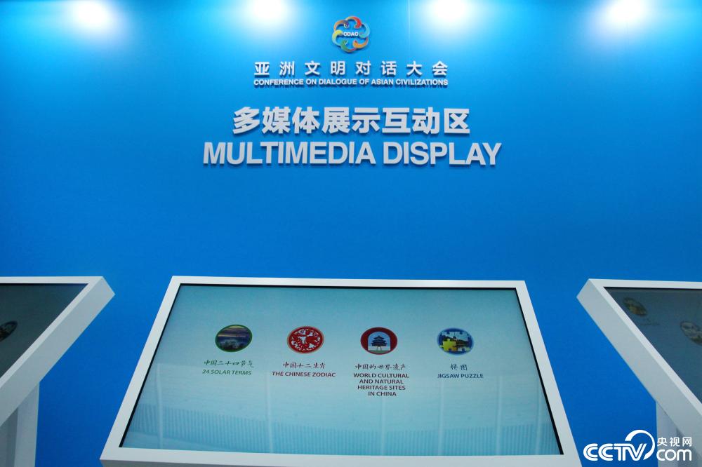 大会新闻中心设置的多媒体展示互动区,可现场了解中国二十四节气、十二生肖等中国文化。