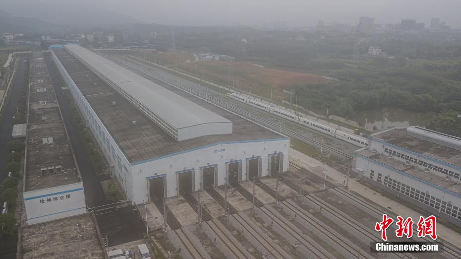 5月14日,航拍广西桂林动车所。桂林动车所拥有目前中国西南地区横向跨度最大的动车检修库。中新社记者 陈冠言 摄