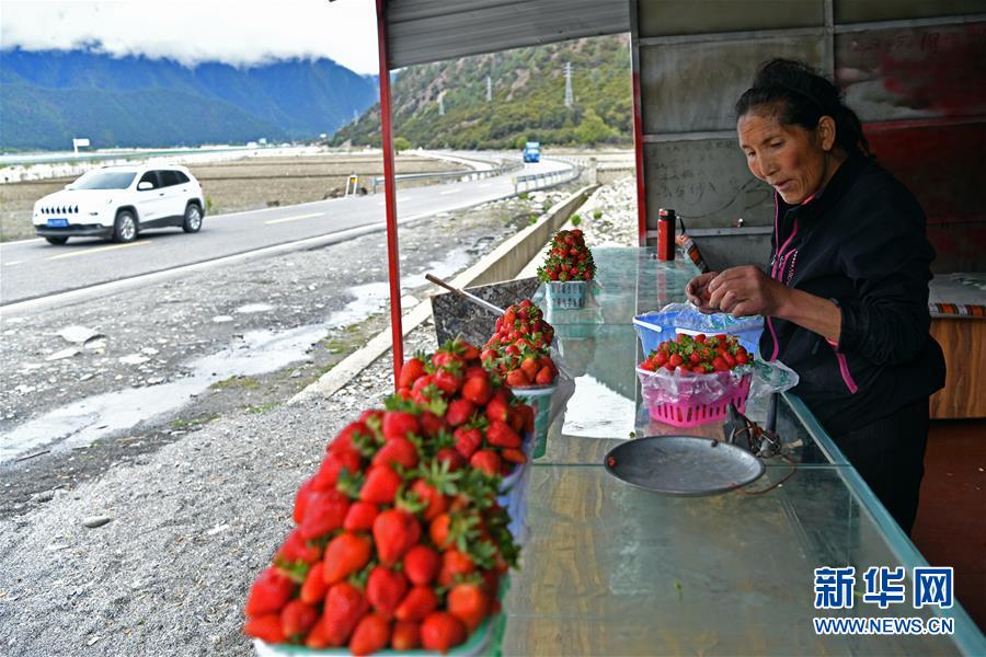 5月14日,久巴村村民扎西拉姆在川藏公路旁的草莓零售店摆放草莓。 新华社记者 李鑫 摄