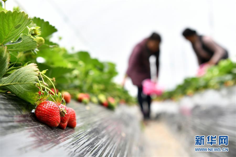 5月14日,久巴村村民在大棚里采摘草莓。新华社记者 李鑫 摄