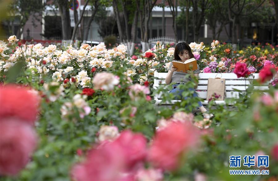 5月14日,游人在天津睦南公园月季花景观中阅读。 新华社记者 岳月伟 摄