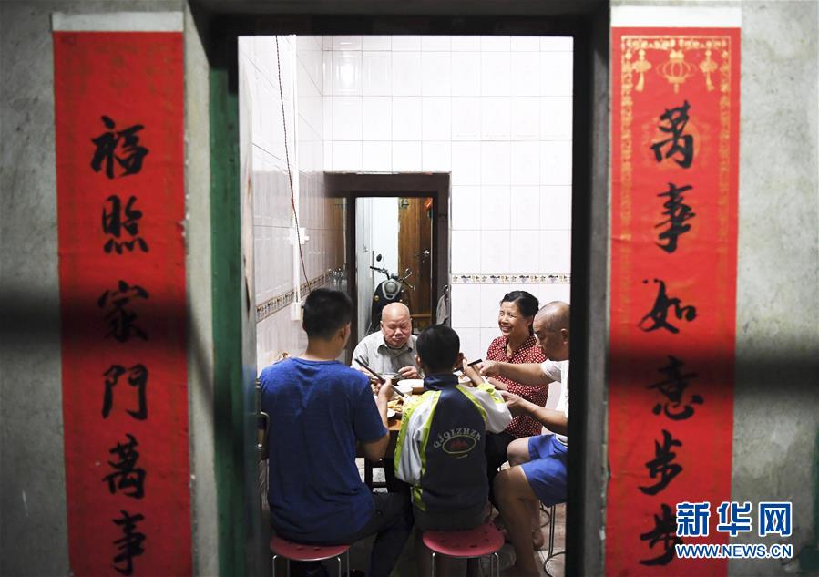5月13日,在柳州市鱼峰区大桥社区红园新村,张小妹一家人在吃晚饭。 新华社发(黎寒池 摄)