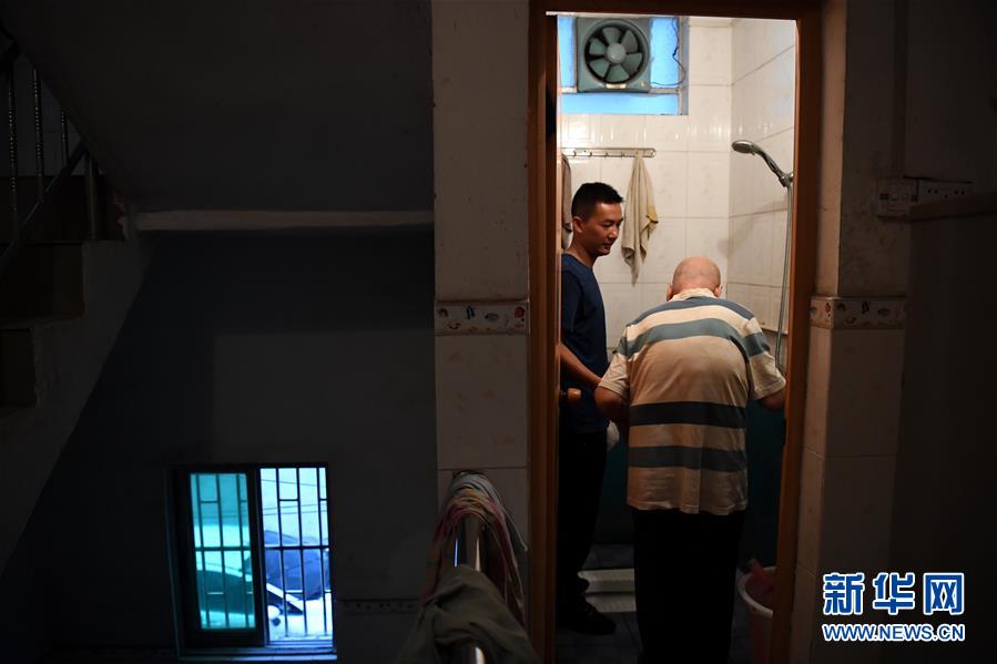 5月13日,在柳州市鱼峰区大桥社区红园新村,张小妹的儿子覃菲搀扶覃义到洗手间洗澡。 新华社发(黎寒池 摄)