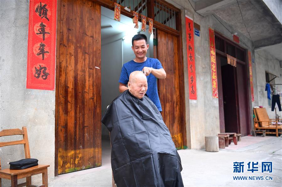5月13日,在柳州市鱼峰区大桥社区红园新村,张小妹的儿子覃菲在给覃义理发。 新华社发(黎寒池 摄)