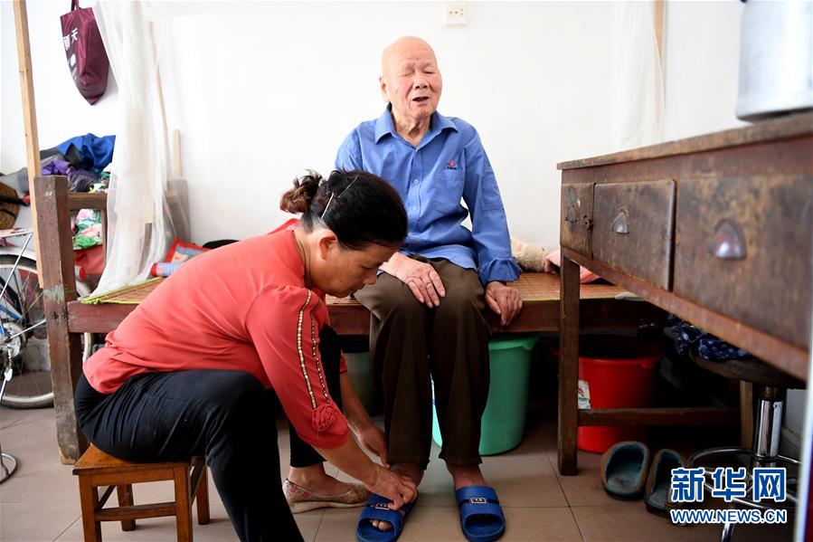 5月14日,在柳州市鱼峰区大桥社区红园新村,张小妹帮助覃义穿鞋。 新华社发(黎寒池 摄)