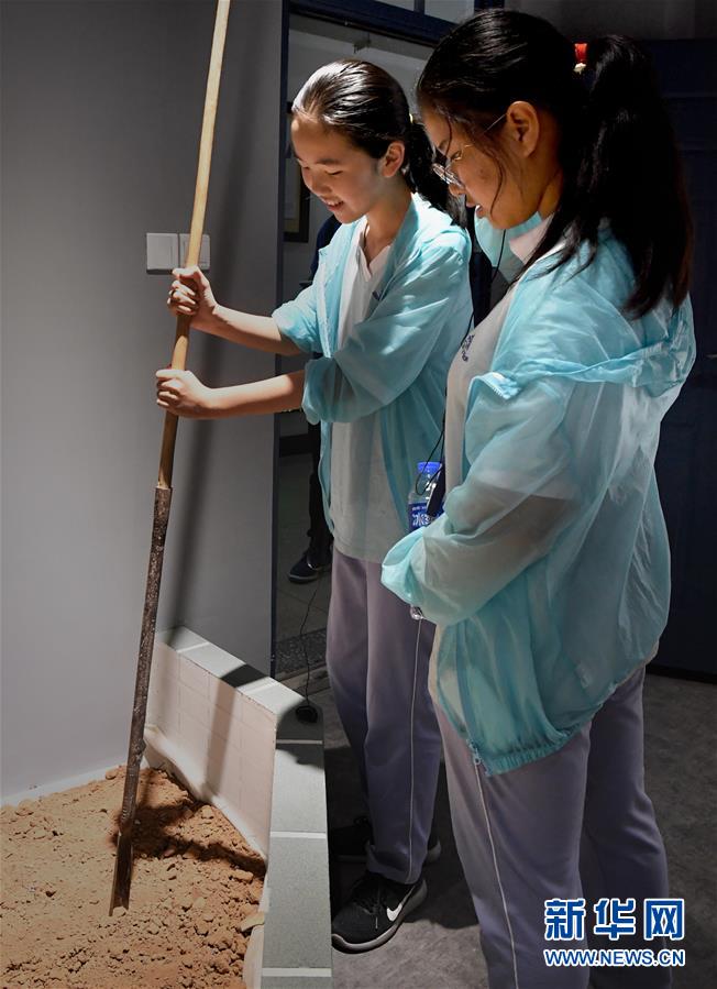 5月14日,两名学生在位于洛阳师范学院内的洛阳铲博物馆体验互动。