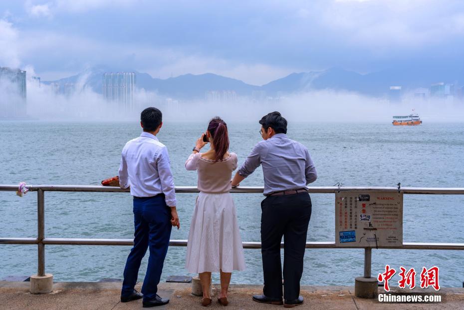 5月15日,香港维多利亚港东部出现平流雾,平流雾沿着海平面从鲤鱼门向西飘入维港东部,从港岛北角远眺九龙半岛,海上云雾缭绕,对岸的建筑物和远山若隐若现,宛如“海市蜃楼”。图为游客在北角码头观看平流雾景象。中新社记者 张炜 摄