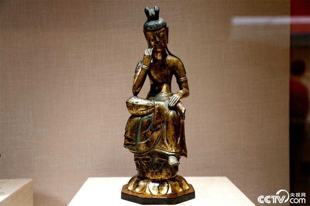 日本东京国立博物馆馆藏的公元7世纪铜鎏金菩萨半跏像。