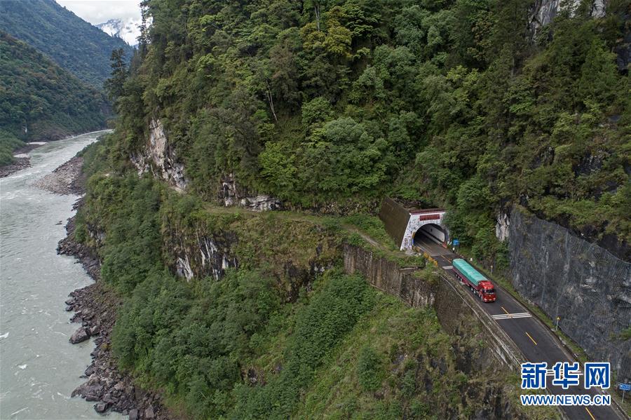 这是通麦路段上的飞石崖隧道(5月15日无人机拍摄)。新华社记者 李鑫 摄