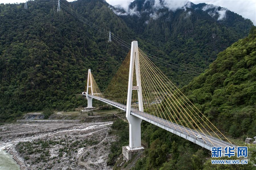 这是通麦路段上的迫龙沟特大桥(5月15日无人机拍摄)。新华社记者 李鑫 摄