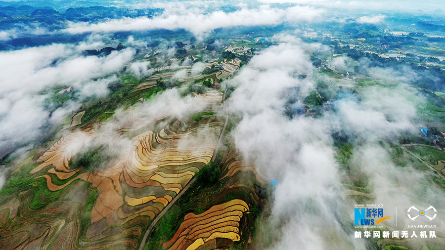 初夏雨后,重庆市南川区盐井梯田呈现出云遮雾罩的乡村景致。万亩良田云雾缭绕,漫步其中,可赏别样田园风光。图为无人机航拍雨后的盐井梯田。新华网发(龚祖章 摄)