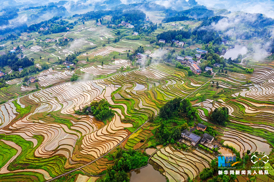 初夏雨后,重庆市南川区盐井梯田呈现出云遮雾罩的乡村景致。万亩良田云雾缭绕,漫步其中,可赏别样田园风光。图为无人机航拍雨后的盐井梯田。新华网发(龚祖章 摄)