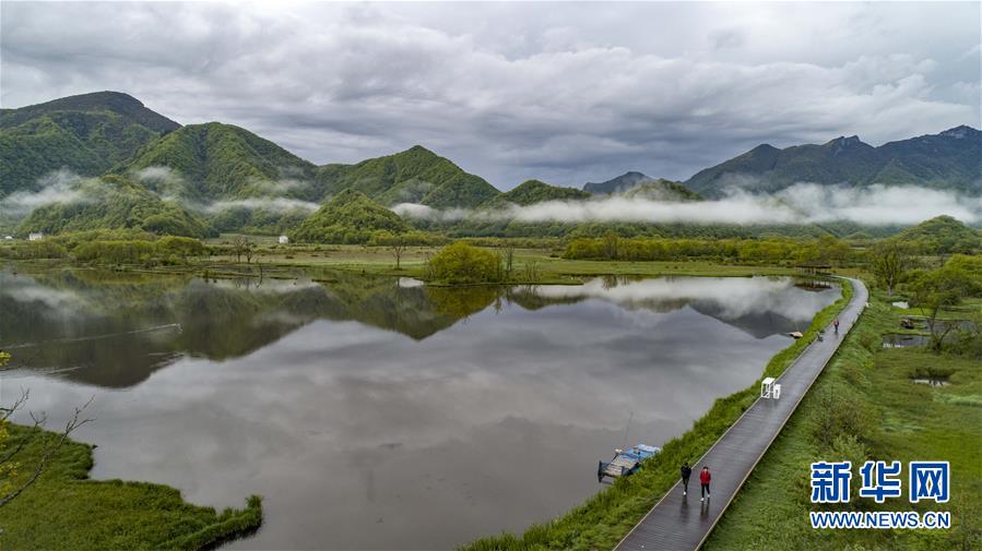 神农架大九湖高山湿地风光(5月16日无人机拍摄)。 在“华中屋脊”湖北神农架深处有一片高山湿地,一条小溪串起9个湖泊,故名“大九湖”。这里群山环绕,风光秀丽,宛如世外桃源。 新华社记者 杜华举 摄