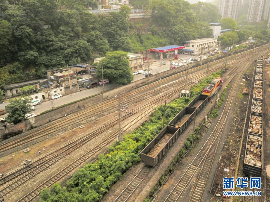 一列准备分离的车组在重庆南站使用驼峰(无人机5月15日摄)。新华社记者 刘潺 摄