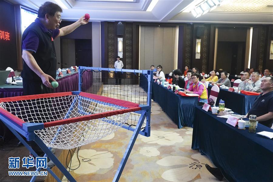5月16日,国家级社会体育指导员陈天祥给学员上课。 当日,由浙江省老年人体育协会主办的2019年全国部分省市老年人兜球教练员裁判员培训班在宁波余姚举行,来自各地近百位学员参加本次培训。 新华社发(张燕辉 摄)