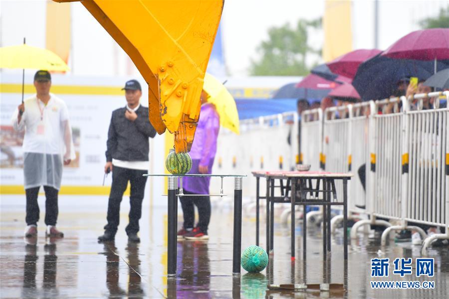 5月16日,一辆挖掘机在长沙国际工程机械展览会上进行“切西瓜”表演。 5月16日,在长沙举办的2019长沙国际工程机械展览会上,各类工程机械设备上演“大比武”,吸引了观众和客商的目光。据悉,本次展览会将持续到5月18日。 新华社发(陈泽国 摄)