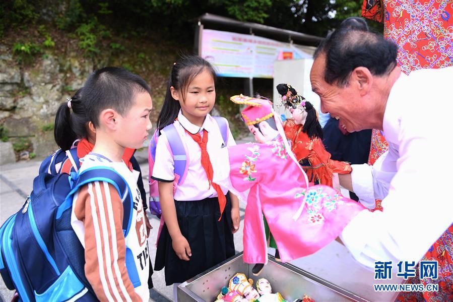 5月15日,郑运德(右)在柘荣县仙屿公园向小朋友讲解布袋戏的木偶人物。 柘荣布袋戏的非遗代表性传承人郑运德17岁开始跟哥哥学习布袋戏,已为群众表演了50多年。 一张普通的桌子用帷布围住便成为“戏台”,郑运德既当导演又当演员,表演时他在戏台里面手、脚、口、身并用,独自吹拉弹唱,用双手的五指操纵木偶,一个人演绎传统戏曲中多种艺术形象。 柘荣布袋戏又称大拇指戏,是一种历史悠久的福建传统微剧种之一,2008年被列入福建省首批非物质文化遗产保护名录。郑运德说,柘荣布袋戏是柘荣的文化瑰宝,如今坚守着这门老艺术的表演者寥寥无几,希望能有更多的年轻人来学习传承。 新华社记者林善传摄