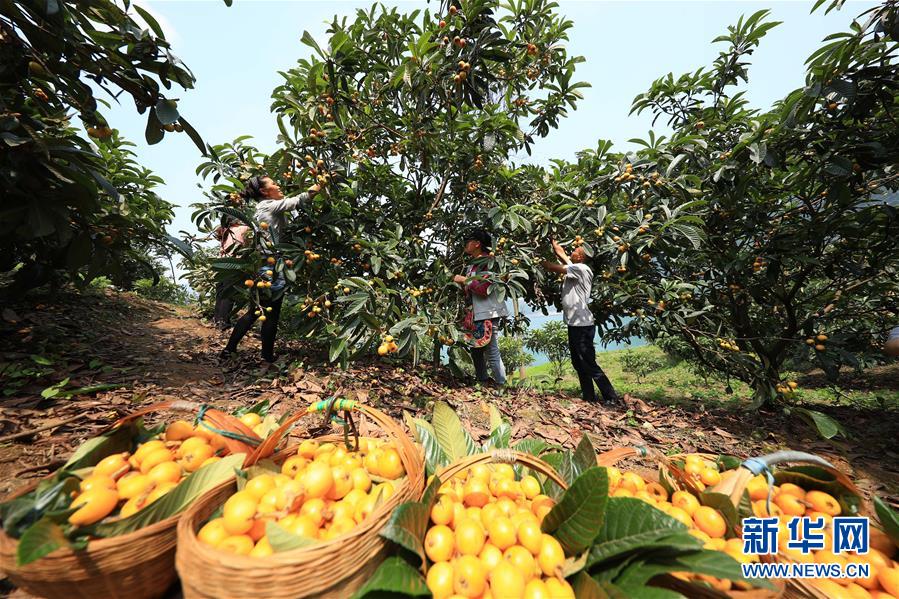 5月16日,游客在贵州省毕节市织金县龙场镇中心村采摘枇杷。 时下,贵州省毕节市枇杷进入收获期,村民忙着采摘枇杷出售,一片丰收景象。 新华社发(韩贤普 摄)