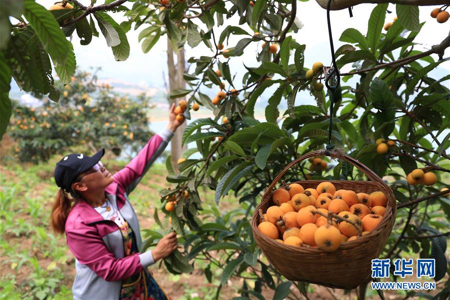 5月16日,游客在贵州省毕节市织金县龙场镇中心村采摘枇杷。 时下,贵州省毕节市枇杷进入收获期,村民忙着采摘枇杷出售,一片丰收景象。 新华社发(韩贤普 摄)