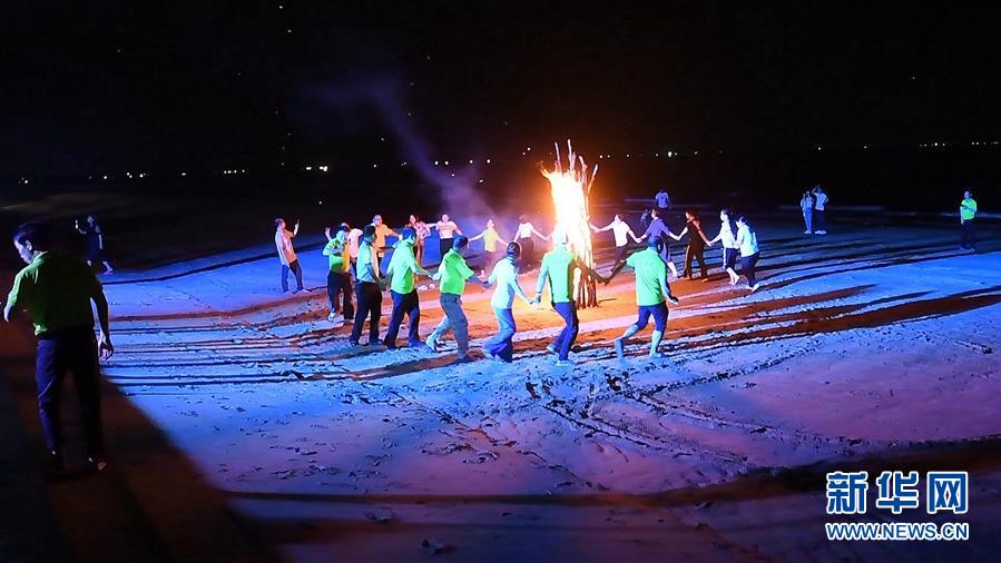 游客在位于广西东兴市江平镇的京族三岛金滩参加篝火晚会(5月14日摄)。 滨海而居的京族是中国唯一的海洋民族,主要聚居在广西东兴市江平镇的京族三岛——万尾、巫头和山心,与越南隔海相望。自5月1日休渔期起,当地京族群众借助岛、滩、海的风光优势发展旅游业,开辟新的增收途径。 新华社记者张爱林摄