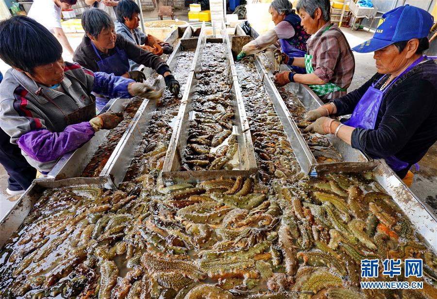 5月16日,乐亭县姜各庄镇前营村一家海产品加工企业的工人在加工海参。 近年来,河北省乐亭县依托当地海域水质、气候条件,引导渔民发展池塘造礁养殖海参。目前该县海参养殖面积达6万亩,年产鲜活海参6500吨,取得良好经济效益。 新华社记者 杨世尧 摄