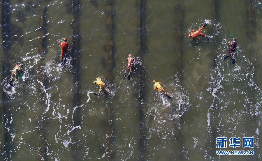 5月16日,乐亭县姜各庄镇二节村一处海参养殖场的工人在捕捞海参(无人机拍摄)。 近年来,河北省乐亭县依托当地海域水质、气候条件,引导渔民发展池塘造礁养殖海参。目前该县海参养殖面积达6万亩,年产鲜活海参6500吨,取得良好经济效益。 新华社记者 杨世尧 摄