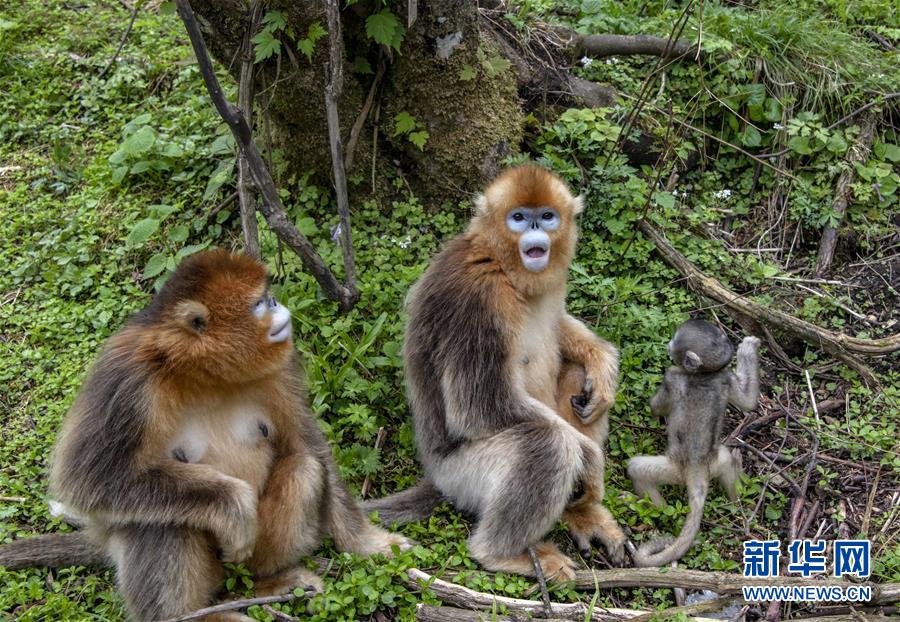 5月16日,金丝猴在神农架大龙潭的山林中玩耍。 新华社记者 董江辉 摄