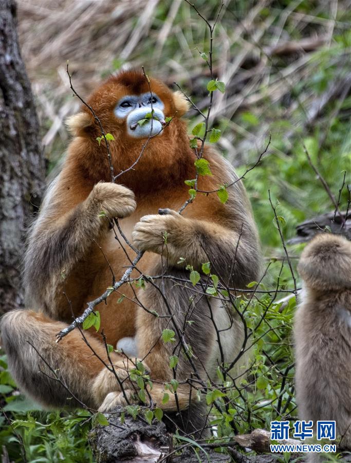 5月16日,在神农架大龙潭的山林中,一只金丝猴在进食植物叶子。 新华社记者 董江辉 摄