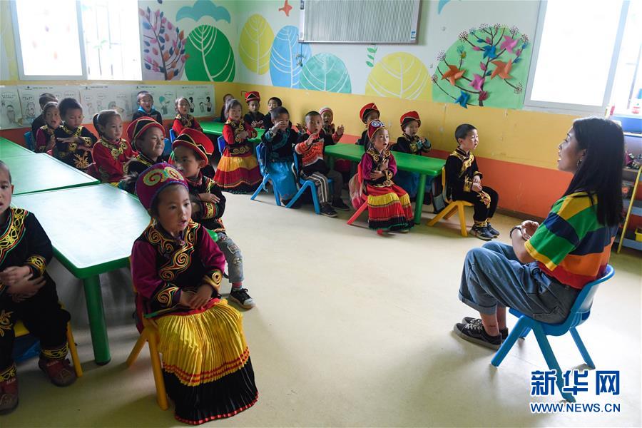 5月14日,在四川省雷波县莫红乡三峡新村幼儿园,老师教孩子们用普通话唱歌。 新华社记者 江宏景 摄