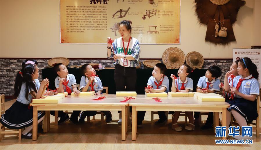 5月17日,在石家庄市桥西区冀台联青年文化创业园,桥西区南马路小学的学生在学习编织技艺。 新华社发(刘沛然 摄)