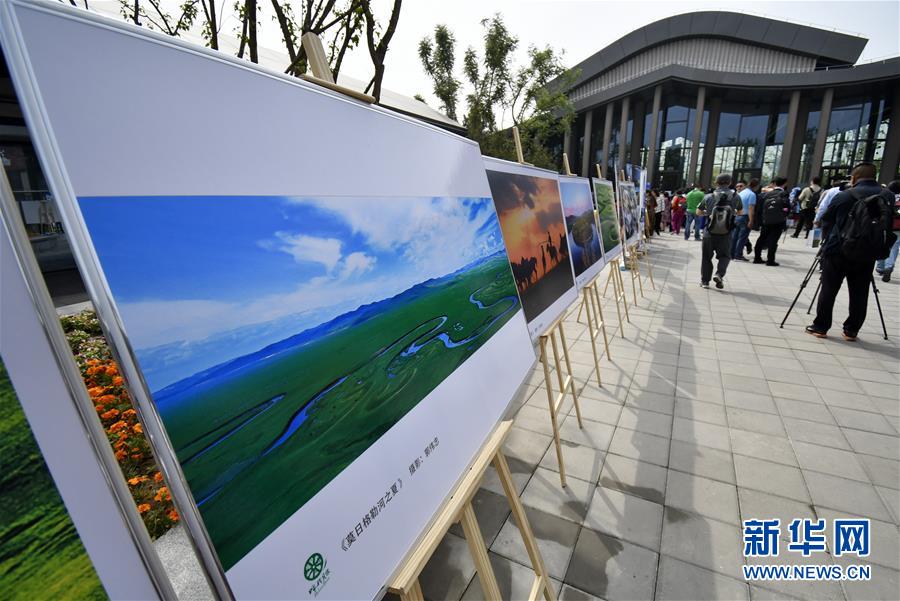在北京世园会“内蒙古日”文化展示活动上展出的呼伦贝尔风光摄影作品(5月17日摄)。 新华社记者 李欣 摄