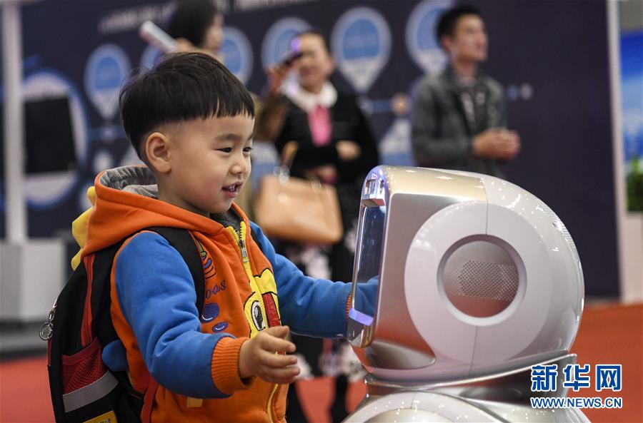 5月17日,小朋友在与一款智能机器人互动。