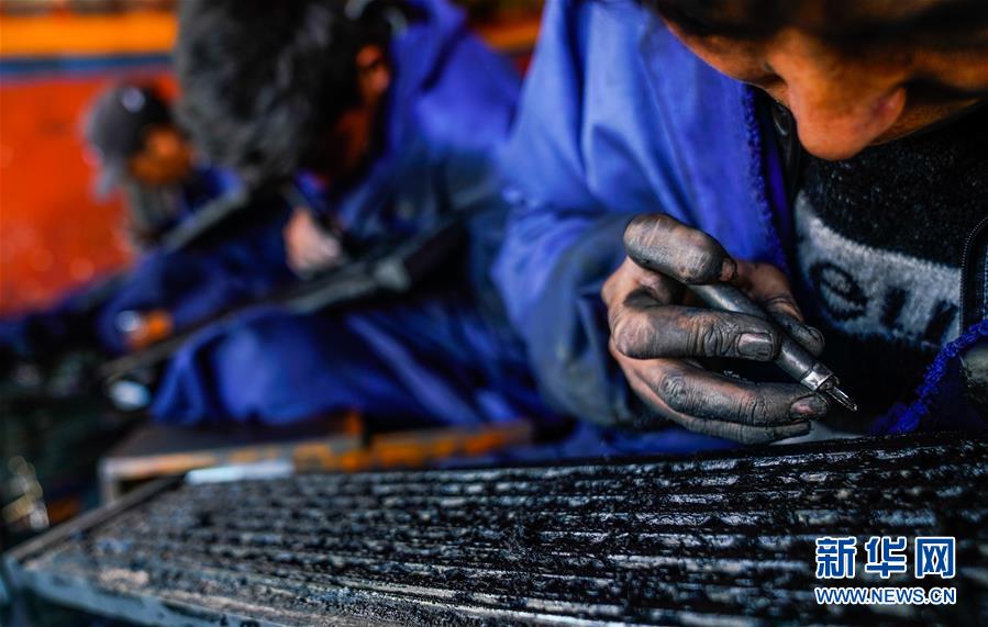 5月17日,来自拉萨市尼木县的清洗匠人对老木刻板进行清理。新华社记者 普布扎西 摄
