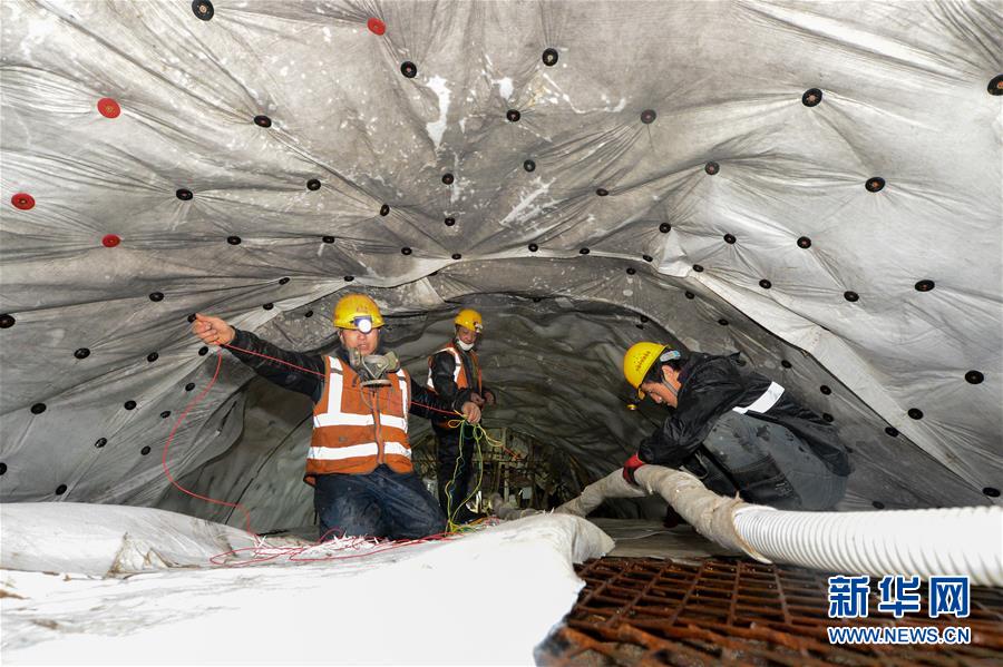 5月15日,施工人员在格库铁路新疆段阿尔金山隧道内铺设防水土工布。 在新疆阿尔金山无人区,中铁隧道局集团格库铁路新疆段S6标项目施工人员克服恶劣的环境,在海拔3500米左右的阿尔金山隧道内施工,全力确保格库铁路(青海格尔木至新疆库尔勒)工程顺利推进。位于新疆若羌县境内的阿尔金山隧道为格库铁路第一长隧道,全长13.195千米。 新华社记者 丁磊 摄