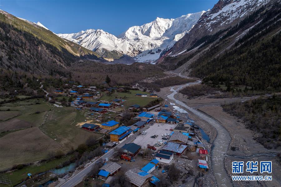 这是米堆冰川和米堆村风光(5月16日无人机拍摄)。 西藏林芝市波密县玉普乡境内的米堆冰川凭借靠近川藏公路的区位优势,吸引越来越多的游客前来观光游览。波密县因其境内冰川众多被称为“冰川之乡”。 新华社记者 李鑫 摄
