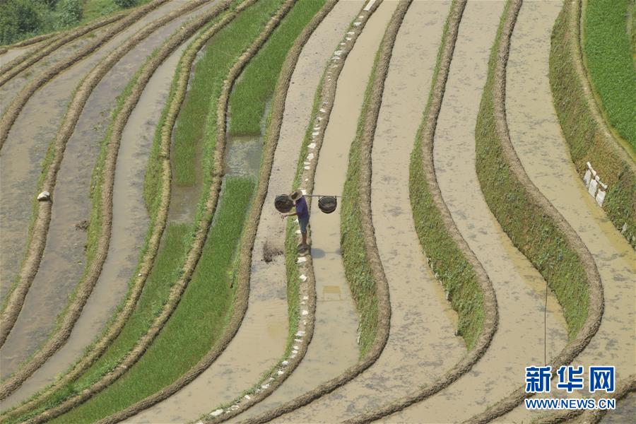 5月18日,在贵州省黔东南苗族侗族自治州从江县加勉乡别通村,村民在梯田里劳作。 新华社发(罗京来 摄)