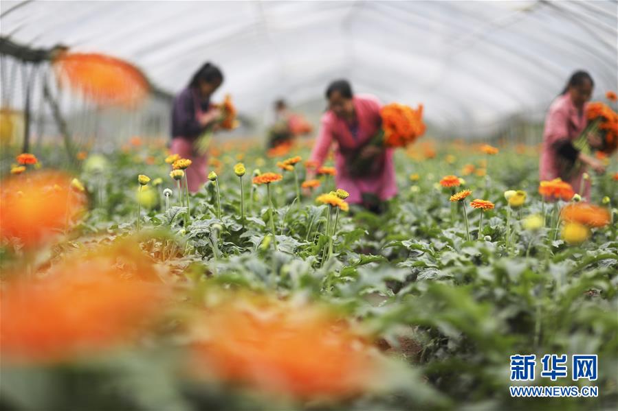 5月18日,在贵州省赤水市宝源乡联奉村的鲜花种植基地,村民在采收非洲菊。 新华社发(王长育 摄)