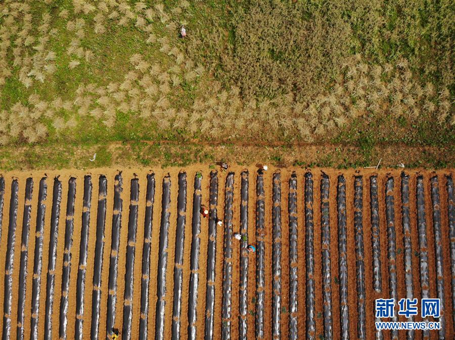 5月18日,在贵州省毕节市黔西县莲城街道龙潭社区,村民在田间劳作(无人机拍摄)。 新华社发(韩贤普 摄)