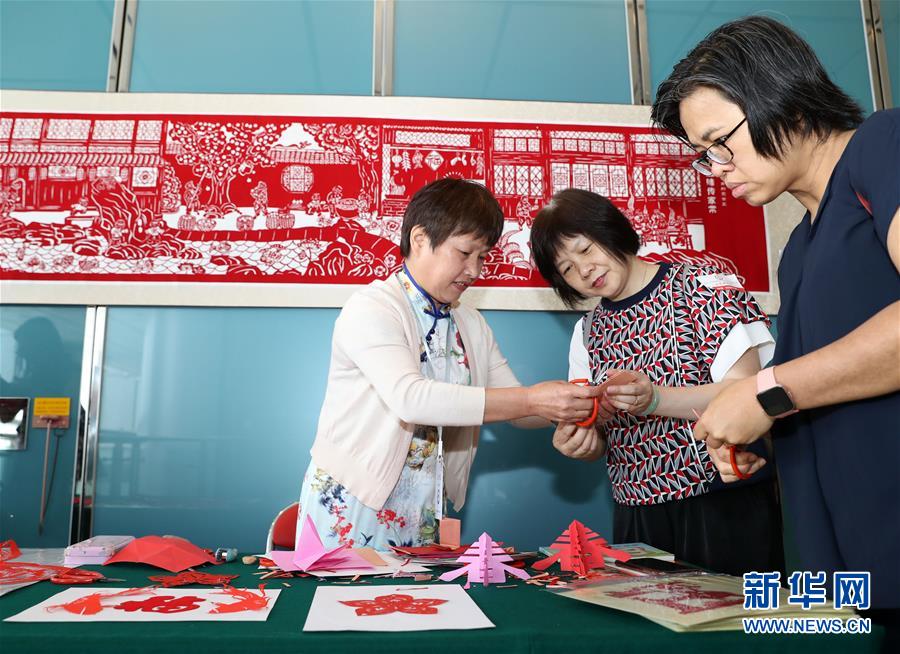 5月18日,访客在香港中联办学习剪纸。 当日,中央人民政府驻香港特区联络办公室第三次公众开放日活动拉开序幕,主要面向居港台湾同胞和香港义工团体,为台湾同胞和香港社会了解国家发展和两岸关系走向打开一扇窗。 新华社记者 李钢 摄