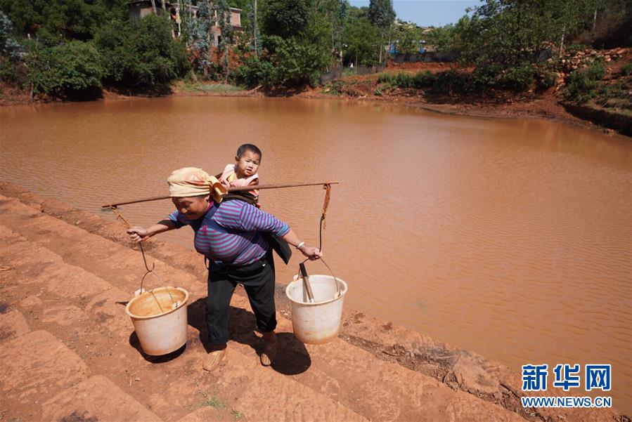 5月17日,巡检司镇乌稠村村民杨永珍从附近的坝塘挑水。 云南省红河哈尼族彝族自治州弥勒市大部分地区气象干旱等级近期已达中旱,其中山区和半山区达到重旱,18.8万亩农作物受旱,2700余人、960多头牲畜饮水困难。当地已组织4.2万人、1万台车辆投入抗旱工作。 新华社记者 秦晴 摄