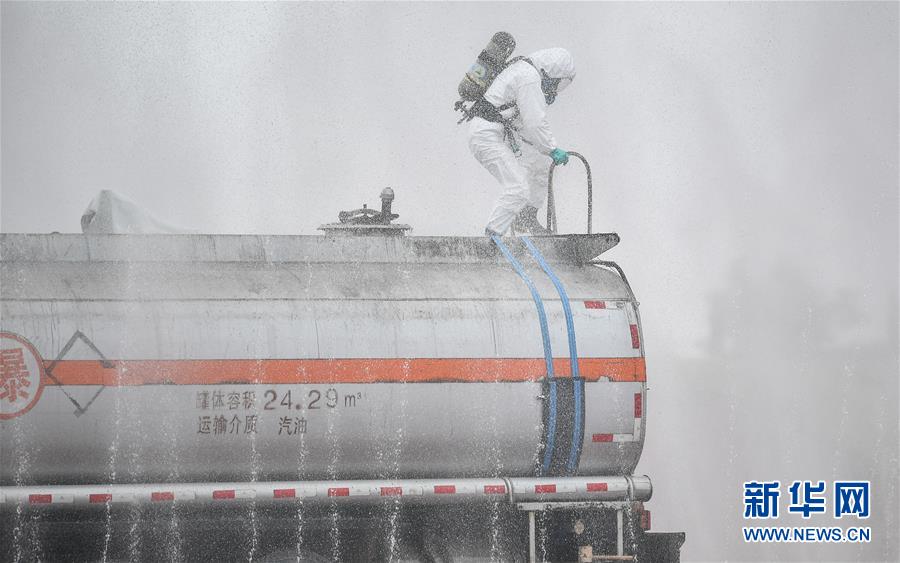 5月18日,消防员在进行危险化学品运输车交通事故救援演练。 当日,四川2019年省级抗震救灾综合演练在成都市金堂县举行。 新华社记者 薛玉斌 摄