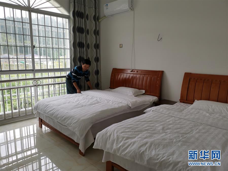 在浏阳市张坊镇田溪村,贫困户罗铿在整理客房,他依托自己的房子开办民宿(5月9日摄)。 新华社记者 刘良恒 摄