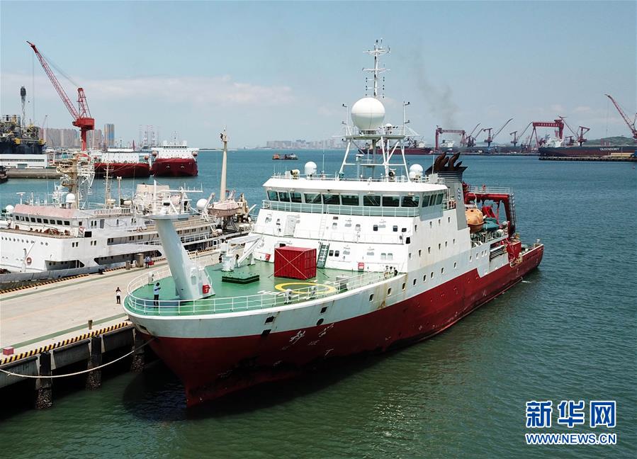 5月18日,靠泊在青岛母港的“科学”号准备解缆起航(无人机拍摄)。 当日,我国新一代远洋综合科考船“科学”号从青岛母港起航,将对全球最深海沟——西太平洋马里亚纳海沟的一座人类从未探索过的海山进行精细调查。 新华社记者 李紫恒 摄