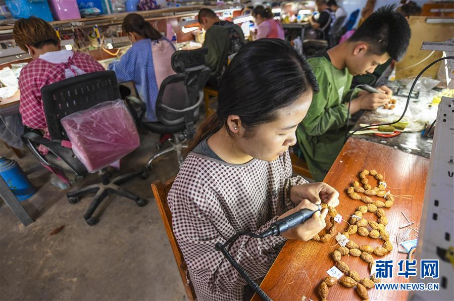 5月18日,永清县别古庄镇核雕企业技工在制作雕刻作品。 新华社记者 李晓果 摄