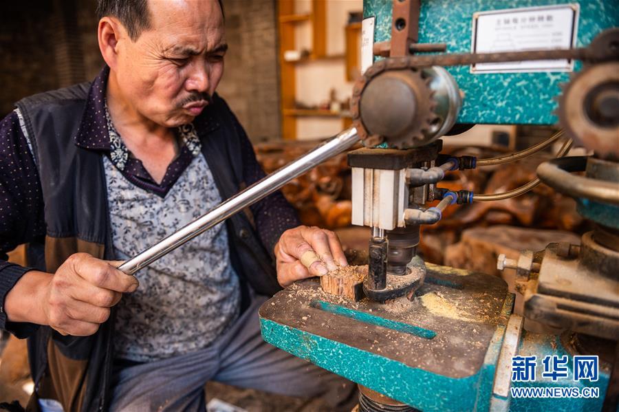 5月18日,刘德付在工艺厂内加工木制品。 新华社记者 陶亮 摄